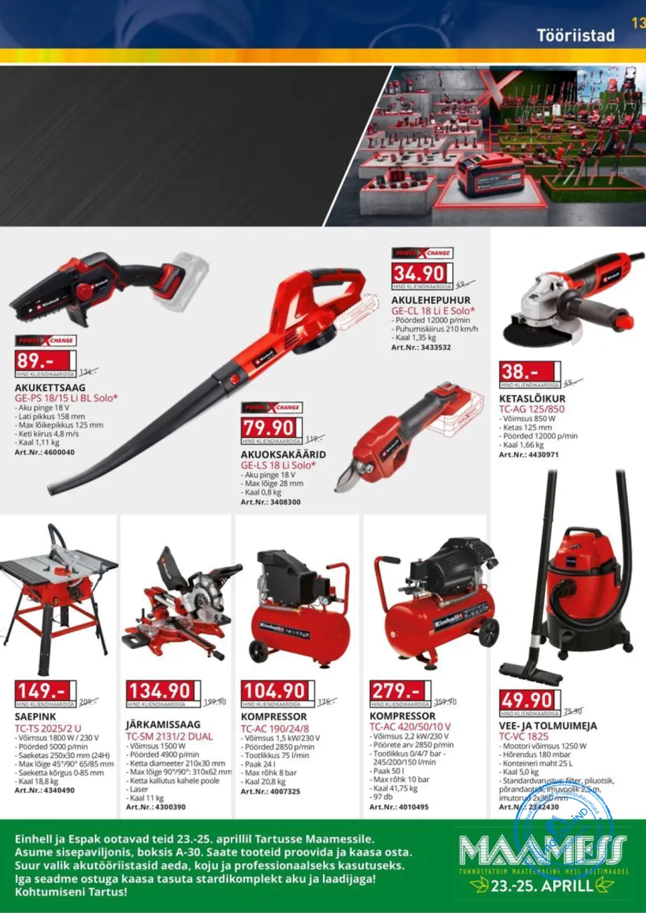 - Tööriistad ja seadmed: Akutrellid, saed, kompressorid ja kÀsitööriistad tipptootjatelt. Espak on tuntud oma laia professionaalse tehnika valiku poolest, mida kampaaniate ajal saab soetada tunduvalt taskukohasema hinnaga.
